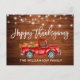 Rustikales Holz - Pinselschrift Wasserfarbe Vintager roter LKW mit Pumpkins und Herbstleaves, String Lights - Glückliches Dankeschön Postkarte