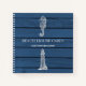 Ein rustikales Design mit einem blauen Holzhintergrund, das ein Seepferd und einen Leuchtturm illustriert. Passen Sie den Namen des Strandhauses an und machen Sie es zu Ihrem eigenen. Ein perfektes Gästebuch für Strandurlauber.