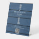 Ein rustikales Design mit einem blauen Holzhintergrund, das ein Seepferd und einen Leuchtturm illustriert. Passen Sie den Familiennamen und das festgelegte Datum an und machen Sie es zu Ihrem eigenen. Ein perfektes Strandhaus-Dekor oder ein Geschenk zum Thema Küste für alle, die das Meer Lieben.