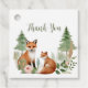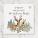 Weiche Aquarellgestaltung für eine Whimsikfeier mit einem Hirsch, Kaninchen und Fuchs inmitten eines Waldbrand-Hintergrundes.