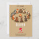 This charming kids’ birthday party invitation features adorable woodland animals — including fox, raccoon, bear, deer, and owl — sitting around a cozy campfire wearing party hats. Perfect for outdoor, nature, or camping-themed celebrations.