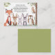 Erstellen Sie eine individuelle Buchungsanfrage für Babygehäuse-Karten für Ihre Woodland-bezogene Babydusche oder Veranstaltung. Niedliche Waldtiere schauen auf und ein schlauer grüner Hintergrund auf der Rückseite.