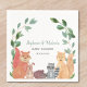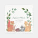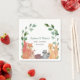 Die Papierservietten der Babydusche sind mit Tieren aus Aquarellwald dekoriert. Diese Waldfreunde, Fuchs, Raccoon, Igel, Hasen und Eichhörnchen sind von einer rustikalen Vegetation umgeben. Einfach anpassbar. Original Wasserfarbe © Michele Davies.