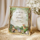 A sweet woodland treat table poster featuring soft watercolor trees and charming forest animals in a warm storybook setting. The deer, squirrel, raccoon, and woodland greenery create a gentle rustic look that is perfect for a nature-inspired baby shower celebration. Soft earthy tones and whimsical details make this design a lovely choice for a gender-neutral event and coordinated dessert table decor. A beautiful poster for inviting guests to take a treat and enjoy your woodland sweets display.