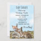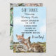 Woodland Creature Animals Baby Shower Einladungen. Ein niedliches Hirsch, Igel und Fuchs sitzen auf einer felsigen Waldlandschaft.