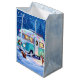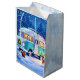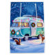 A cute whimsical Christmas gift bag with a woodland creatures theme. A deer and squirrel sitting nearby a vintage teal camper on a snowy winter night.