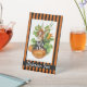 Begrüßen Sie die Herbstsaison mit dieser illustrierten Holzernte Elf / Nymphe, die auf großen Kürbissen mit orangefarbenem und schwarz gestreiften Hintergrund und einem anpassbaren Textstreifen am unteren Ende steht