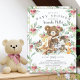 Niedliches Babyduschdesign mit dem süßesten Bären, der auf einem Baumstumpf sitzt, umgeben von Reh, Waschbär, Eichhörnchen, Fuchs, Elch & Fuchs. Gerahmt mit natürlichen grünen Aquarellfarben Blätter Set auf weißem Hintergrund. Dreh unsere Einladung nach hinten, um ein passendes grünes Blatt für eine besondere Touch zu sehen.