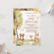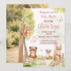 Woodland animals baby girl shower invitation featuring a watercolor bear, deer, and fox. This whimsical forest design includes soft pink florals and a sweet storybook feel, perfect for an enchanted nature-themed celebration.