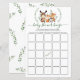 Personalisieren Sie diese niedliche, farbenfrohe Baby Dusche Bingo Spielkarte mit Ihren eigenen Worten einfach und schnell. Dieses Design zeigt die rustikalen Aquarellfarben Grüntöne, Blätter Blattwerk und bezaubernde Waldtiere: Fuchs, Hirsch, Eichhörnchen, Kaninchen, Elche und Waschbär.