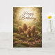 A warm and whimsical birthday design featuring a small cluster of realistic morel mushrooms rising from a mossy forest floor. Soft golden sunlight filters through the trees in the background, creating a peaceful woodland glow that pairs beautifully with the elegant “Happy Birthday” script above. Earthy textures and natural details make this card perfect for nature lovers, foragers, and those who appreciate rustic, organic beauty.