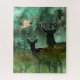A lovely illustration with shades of green and brown with a woodland nature scene of two deer, a buck and a doe, with a hawk flying.