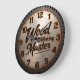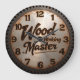 This image displays a round wall clock designed to resemble a distressed, rusty circular saw blade. The clock face is metallic silver with prominent dark brown rust along the serrated outer edge, mimicking the teeth of a saw. The central text reads "Wood Working Master" in a bold, dark brown, stylized font with a textured appearance. "Wood" is in a larger, flowing script, while "Working" is smaller and "Master" is a larger, more structured script below it. The numbers from 1 to 12 are also in a matching dark brown. The clock has dark gray hands. This design is ideal for a workshop, garage, or as a gift for a woodworking enthusiast.