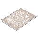 Dieses weiße Mandala sitzt auf einem hellbraunen oder bräunlichen Hintergrund. Die Farbe ist weich und natürlich. Bei manchen Lichtern sieht es vielleicht wie ein warmes Grau aus. Teil der Rosenn Mandala Kollektion.