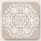 Dieses weiße Mandala sitzt auf einem hellbraunen oder bräunlichen Hintergrund. Die Farbe ist weich und natürlich. Bei manchen Lichtern sieht es vielleicht wie ein warmes Grau aus. Teil der Rosenn Mandala Kollektion.
