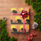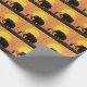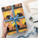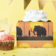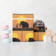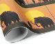 Ein junger Mann steht auf einem Feld gegenüber einem Wollhaarmammut als große, leuchtende Sets hinter ihnen und schafft eine dramatische Silhouette