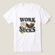 Bold skeleton in a hammock under Work Sucks text; vibrant palette, cheeky office humor, ideal for casual tees and gift-oriented apparel.