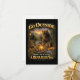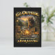 A darkly humorous wilderness scene shows a roaring bear crashing a peaceful mountain campsite at sunset.