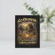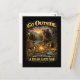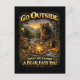A darkly humorous wilderness scene shows a roaring bear crashing a peaceful mountain campsite at sunset.