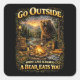 A darkly humorous wilderness scene shows a roaring bear crashing a peaceful mountain campsite at sunset.