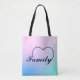 Das Wort "Familie" wurde in das Oberteil eines Set eingearbeitet, mit einem farbenfrohen Hintergrund auf einer überdachten Tüte