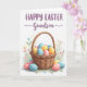 Designed with a bright springtime look, this greeting card centers on a woven light-brown basket with a curved handle, drawn with fine strand details. Inside are smooth egg shapes in pastel pink, sky blue, and butter yellow, with a few resting at the base as if gently tumbled out. A white background keeps everything airy, while slim green stems and simple blossoms in light blue, soft orange, and pale pink frame the basket like a quiet garden scene 🌷. Near the top, the text “HAPPY EASTER” sits prominently in uppercase, using a straightforward letter style in warm purple. Just below it, “Grandson” appears in a flowing letter style, also purple, with small decorative swirls that feel like an affectionate flourish 🐰. Soft shading under the basket and eggs adds depth, and the pastel eggs cluster close together in front of the basket’s lower edge. Behind the handle, a few flowers peek upward with rounded petals and thin leaves in gentle spring colors.