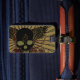 Ein bedrohlicher Schädel mit den Flügeln und zwei Eidechsen, die auf ihn gegen einen Hintergrund von Formen und von splats kriechen.