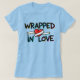 This festive design features the phrase 'Wrapped in Love' with a heart and ribbon, perfect for spreading holiday cheer. Ideal for couples, families, and anyone looking to celebrate the warmth of love during the Christmas season.