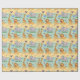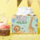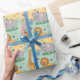 Wrapping paper featuring a playful pattern of cartoon animals, including lions, elephants, and giraffes, on a pastel yellow and blue background. The image shows both an unrolled and flat sheet, evoking a cheerful and whimsical tone.