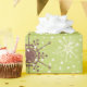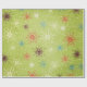 Hübsches Urlaubspapier oder Winterverpackungspapier mit einem skurrilen Schneeflocken-Design auf grünem Hintergrund mit Schneeflocken aus Creme, Rot, Braun und Blau.