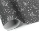 Sterne, Planeten, Felsen und vieles mehr in dieser futuristischen Vision des Weltraums. Illustriertes Cartoon-Verpackungspapier mit weißen Linien auf schwarzem Hintergrund.