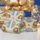 Wrapping paper with cartoon animals, featuring smiling lions and elephants against a pale yellow background. The tone is playful and cheerful.