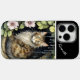 Eine flauschige Katze mit grünen Augen sitzt in einer weitläufigen Höhle mit Wassertropfen, die von oben fallen. Die Katze scheint den Betrachter mit einem Hauch von Neugier und Zufriedenheit zu betrachten.