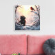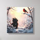 Eine ruhige Winterlandschaft mit einem winzigen schwarzen Kätzchen und einem lebhaften roten Rotkehlchen vor einem Hintergrund frostigen Blätterdaches und sanft fallender Schneeflocken, die ein Gefühl von Magie und Wunder in einem filmischen, epischen Stil weckt, der an klassische matte Gemälde und atmosphärische digitale Kunst erinnert.
