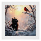 Eine ruhige Winterlandschaft mit einem winzigen schwarzen Kätzchen und einem lebhaften roten Rotkehlchen vor einem Hintergrund frostigen Blätterdaches und sanft fallender Schneeflocken, die ein Gefühl von Magie und Wunder in einem filmischen, epischen Stil weckt, der an klassische matte Gemälde und atmosphärische digitale Kunst erinnert.