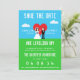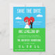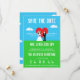 Diese lustige, einzigartige und wunderschön geekte Save the Date Hochzeitsankündigung zeigt 8-Bit Braut- und Bräutigam-Charaktere, die sich vor einem roten Herz anschauen, mit einem strahlend blauen Himmel mit flauschigen weißen 8-Bit-Wolken.