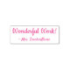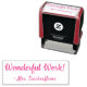 Dieses inspirierend Design der Gummi-Briefmarke beinhaltet die inspirierend Feedback-Nachricht "Wunderbare Arbeit!" und den Namen eines individuell angepassten Lehrers. Es könnte von einem Lehrer, Pädagogen oder Tutor verwendet werden, um zu zeigen, dass der Schüler eine großartige Arbeit geleistet hat.