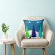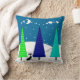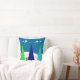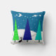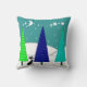 Retro Weihnachtsbäume und Katze Pillow Kissen, drei künstlerische retro Bäume in den Schatten von aquamarinem und Blau auf einem dunkleren aquamarinen und blauen Hintergrund. Bäume umrissen mit schneebedeckten Hügeln und schwarzer Katze. Zurück vom Kissen in koordinierenfarben aber im Hintergrund ist eine hellere blaue/grüne Farbe.