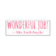 Dieses motivierende Design aus Gummi-Briefmarke beinhaltet die Motivationsbotschaft "WONDERFUL JOB!" und den Namen eines Lehrers oder Lehrers. Es ist auch mit einem dekorativen Karo versehen. Es könnte von einem Lehrer, Lehrer, Lehrer oder Tutor benutzt werden, um anzuzeigen, dass der Schüler gut abgeschnitten hat.
