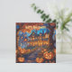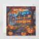 Diese Karte verfügt über ein kurioses Herrenhaus im Wald mit lichtdurchfluteten Fenstern, umgeben von vielen Kürbissen. Senden Sie Ihren Lieben unheimliche Halloween-Grüße! Eigener Text.