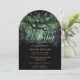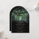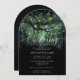 Eine skurrile Aquarell-Illustration eines reichen, üppigen, grünen und drapierten Laubbogens mit Blumendetails in smaragdgrün, glitzernd hell mit Feenlampen und zauberhaftem Staub, schmückt diesen Frühjahrsommer Herbst die Baby Dusche mit einem verzauberten Waldthema. Eine elegante, moderne Einladung für eine märchenhafte Babydusche. Ideal für junge Mütter und Familien, die die märchenhafte Waldlandschaft, den Märchenwald oder den Märchengarten mit smaragdgrün, mauve und gold Lieben.