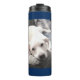 Wunderschöner, blauer weißer Hund mit Vater Thermosbecher