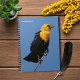 Wunderschöner, gelb gehauchter Schwarzvogel an ein Notizblock