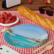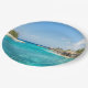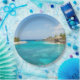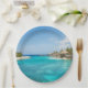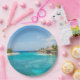 Papier Teller mit einem schönen Foto mit einem tropischen Badeort. Hübsches blaues Wasser und weißer Sandstrand mit Strohhütten geben ihm eine ruhige Inselatmosphäre.