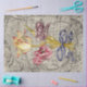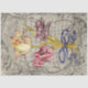 Gelb, rot und dunkelbordeauxfarben - prächtige, holländische gestreifte Tulpen mit goldenen Blätter in einem Bouquet, der mit einem zarten lila Samtband verbunden ist. Im Hintergrund sehen wir alte, halb verstorbene Dokumente und Mittel. Vintages ephemera blumenentcoupontenpapier.