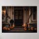 Mit dieser unheimlichen Veranda-Szene mit leuchtenden Jack-o''-Laternen, Kerzenlicht und sprichwörtlichen Spinnennetzen, die über dem Eingang liegen, taucht man in den Halloween-Geist ein. Das dunkle und geheimnisvolle Ambiente verleiht dem Ganzen einen kühlen Ton, der durch die dezente Dekoration, die zum Spuk Ambiente beiträgt, noch verstärkt wird.