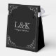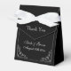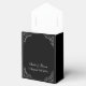Schöne Jahrgang Hochzeit schwarze Gala Gastgeschenk Boxen. Ideal, um den Gästen mit einer Leckerei oder einem Geschenk zu danken. Klassische Typografie-Vorlage für Ehepaare, die heiraten. Ändern Sie die Menge, um den billigen Bulk-Preis zu erhalten. Klassische formale Vorlage für Hochzeit im Retro-Stil. Blüh das Grenzdesign mit Wirbel. Personalisierte Zelt-Form Box mit Optionen für die weiße oder schwarze Krawatte.