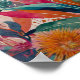 Ein lebendiges und abstraktes botanisches Gemälde mit einer Vielfalt an stilisierten Pflanze und Formen. Das Kunstwerk ist voll mit fett gesättigten Farben, darunter Rosa-, Orange-, Gelb-, Grün- und Blautönen. Die geometrischen Formen haben große, übertriebene Blütenblätter mit komplizierten Mustern, während die Blätter in verschiedenen Formen und Größen dargestellt werden, was eine üppige, vielschichtige Wirkung ergibt. Der Hintergrund umfasst eine Mischung aus kräftigen Farben, Farbenwaschs und spielerischen Polka-Punkten, die Tiefe und Kontrast erhöhen. Schönes Wandkunstgeschenk für jede Anlässe.