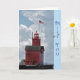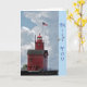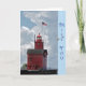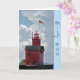 Großer roter Leuchtturm mit Seemöwe.