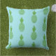 Dieses Throwkissen im Freienwird in einer hübschen Aquafarbe mit einem grünen Ananasdruck gezeigt.